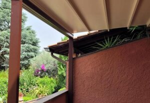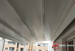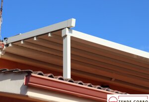 ● Tettuccio realizzato in lamiera zincata grecata e verniciata su un solo lato RAL 9010 o RAL 1013 in abbinamento al telo con rifinitura perimetrale